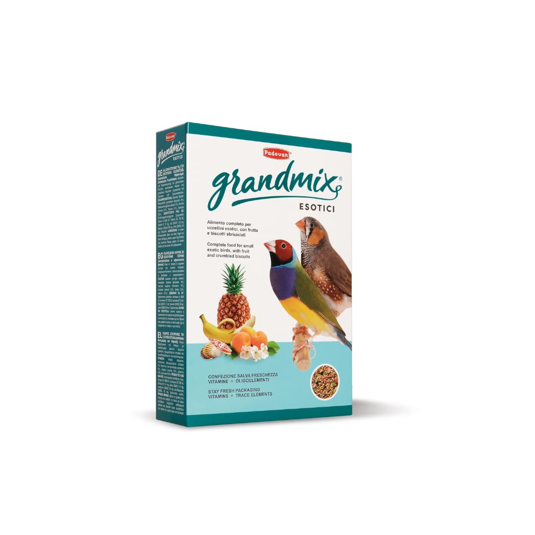 GrandMix Esotici es una mezcla premium para aves silvestres pequeñas como diamantes australianos y estrílidos africanos, con cereales, semillas, fruta deshidratada, galletas y conchas, más vitaminas esenciales para una dieta variada y completa.