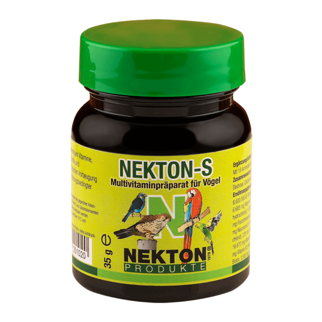 Nekton-S es un complemento alimenticio multivitamínico en polvo diseñado para aves ornamentales y de cría. Contiene una combinación equilibrada de vitaminas esenciales, 18 aminoácidos en forma natural y oligoelementos, que ayudan a prevenir carencias nutricionales.