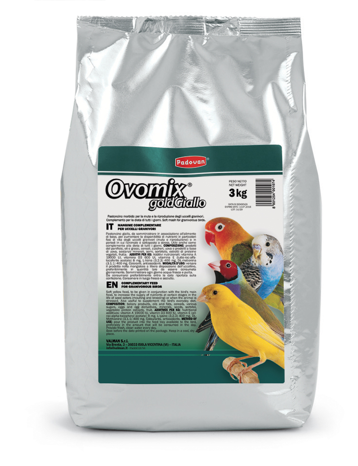 Ovomix Gold Giallo PADOVAN es una pasta de cría amarilla diseñada para aves granívoras como canarios, periquitos y otros pájaros de semilla. Esta preparación se suministra junto con el alimento básico para aumentar la disponibilidad de nutrientes durante periodos de mayor exigencia fisiológica, como la muda, la reproducción o situaciones de estrés, y también puede utilizarse como complemento habitual de la dieta.