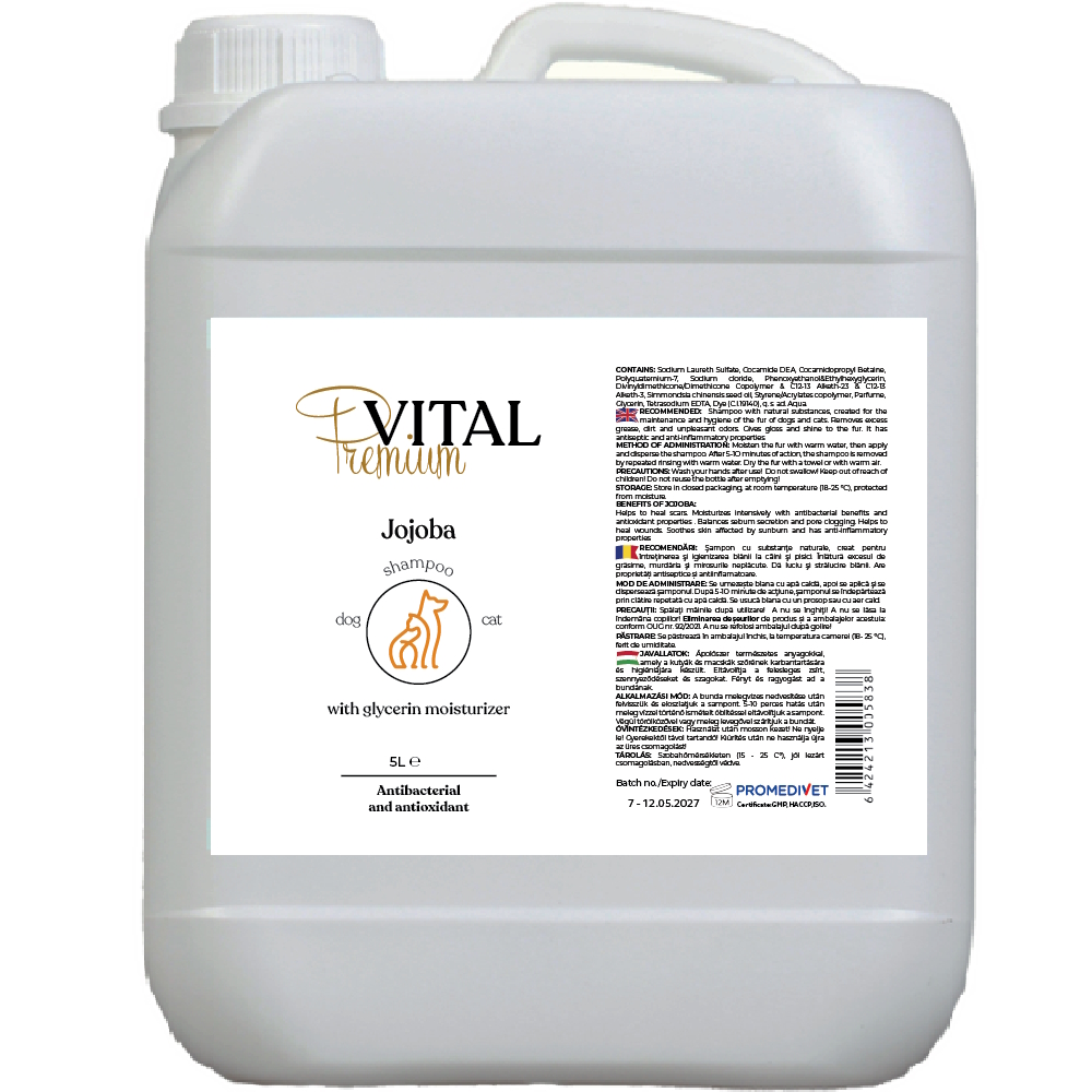 Premium-Vital Shampoo con aceite de jojoba es un producto de cuidado dermatológico y de limpieza para perros y gatos de todas las razas y tamaños. Su fórmula con aceite de jojoba ofrece propiedades hidratantes, emolientes y regenerantes, ayudando a suavizar el pelaje, mantenerlo brillante y facilitar el desenredado durante el cepillado.