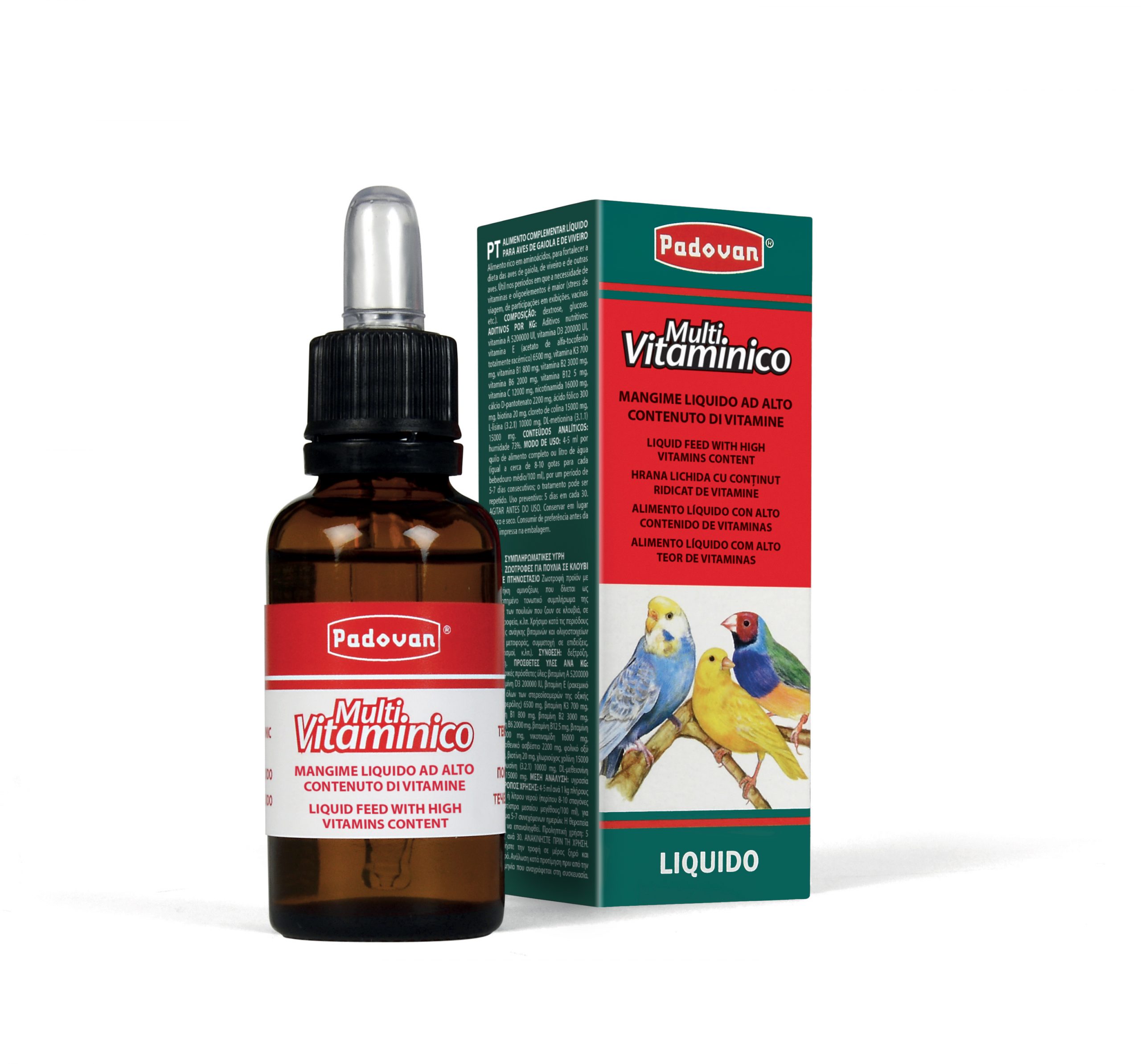 El suplemento multivitamínico líquido PADOVAN es un complemento alimentario para pájaros y aves pequeñas que aporta un amplio espectro de vitaminas esenciales y aminoácidos para reforzar la nutrición diaria. Está especialmente indicado en momentos en que las aves necesitan un aporte extra de vitaminas, como durante el estrés por viajes, concursos, vacunaciones o etapas de muda y recuperación, ayudando a mantener la vitalidad y bienestar general.